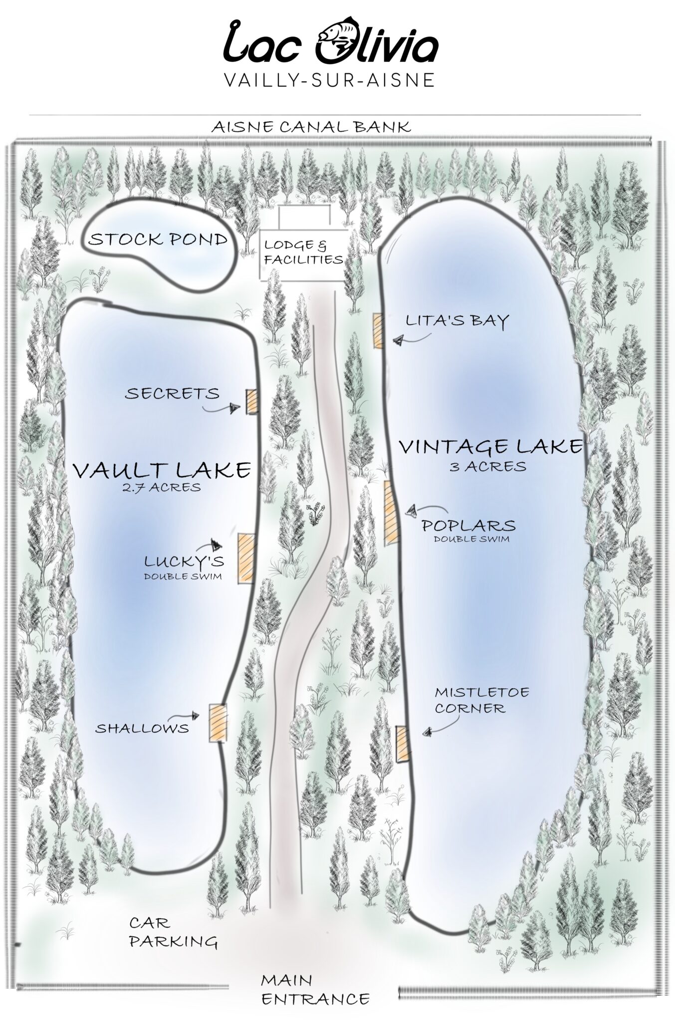 Discover Vault & Vintage lakes at Lac Olivia Fishery, in tranquil Vailly sur Aisne, northern France. 8.5 acres, two mature gravel pit lakes, exclusive & venue bookings, all modern facilities, peace guaranteed.