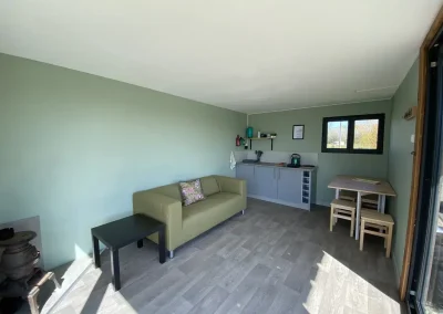 The Periwinkle Gîte can be reserved for an additional fee alongside your exclusive lake booking. This south-facing, detached cottage features an open-plan living space, providing sleeping arrangements for up to four people with one double bed and two singles.